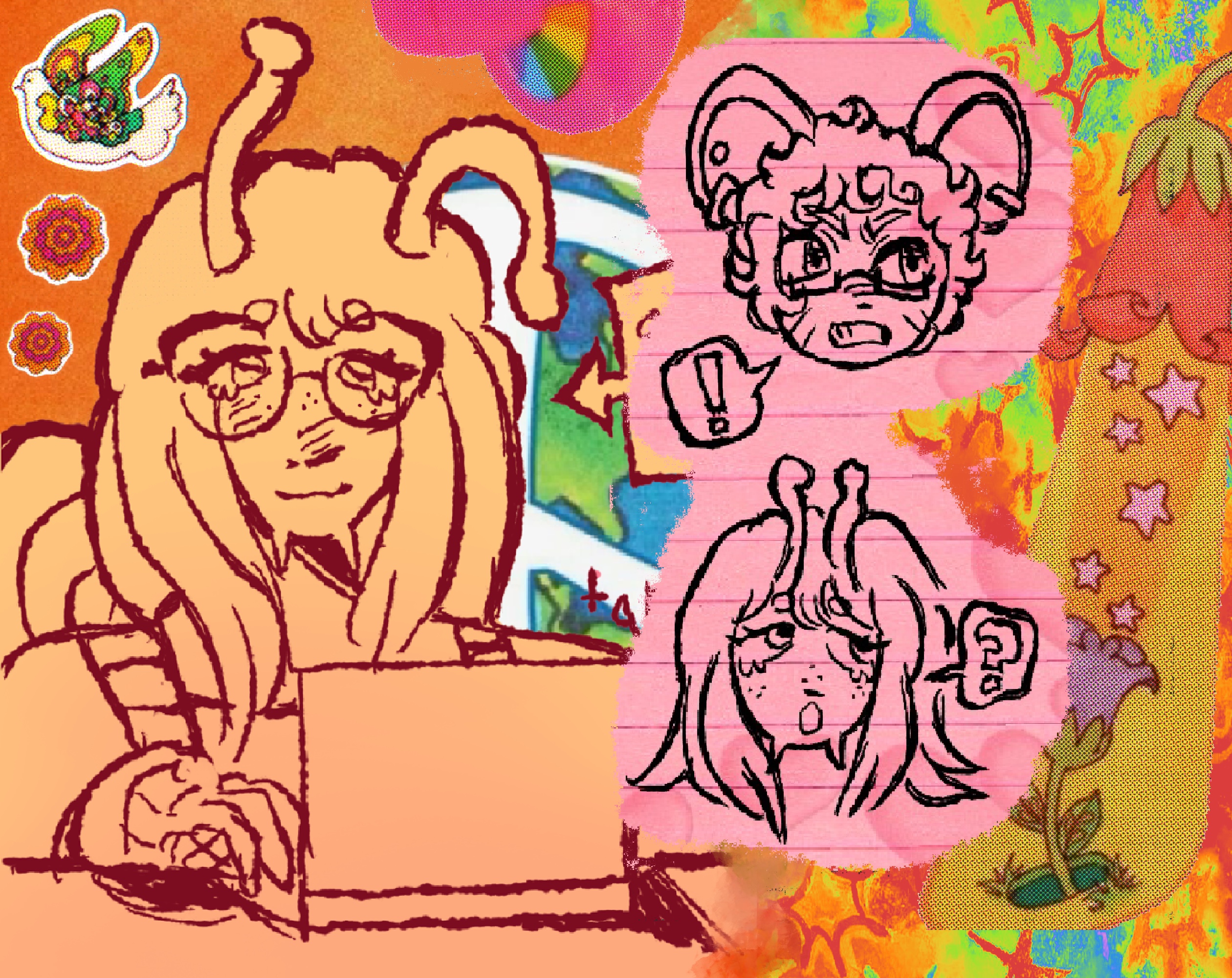 About home and who we find it in. A mixed media zine-comic series focusing on transhet domesticity and everyday life. Featuring kemonomimi-like characters.